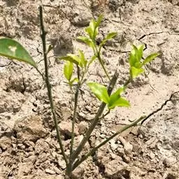 柠檬定干高度约40-50厘米。当嫁接苗抽生春梢,或夏梢老熟后,在距地面40厘米枝梢饱满芽处摘心,促使在25-40厘米处抽发4-6个新梢,形成分枝。如果抽梢不理想,形成分枝少,可抹芽1-2次,促使主干抽生新梢。待枝梢老熟后从上部选留—壮枝为第一主枝,留20-25厘米长,短截先端部分,其余留作辅养枝。