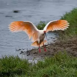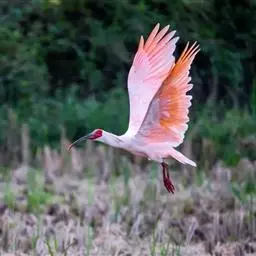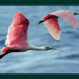 粉红琵鹭(学名:Platalea ajaja):体高87厘米,翼展127厘米,体重1300克,寿命10年。是一种大型涉禽。脚很长,喙长而呈竹片状。成鸟头部光秃及呈绿色,颈部、背部及胸部呈白色,其他的都呈深粉红色。喙呈灰色。雄鸟和雌鸟相似。飞行时的头部向前伸。在丛林或树上筑巢。每次产2-5卵,卵呈白色,有褐色斑纹。