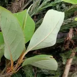 叶互生,革质深绿色,叶背淡绿色,长圆状椭圆形,很少卵状椭圆形,长7-18厘米,宽3.5-8.5厘米,先端骤狭短渐尖或短渐尖而尖头钝,基部楔形,阔楔形或近圆钝,上面深绿色,有光泽,下面灰绿色,被白粉,侧脉每边7-12条,直或稍曲,至近叶缘开叉网结、网眼致密。叶柄长1-3厘米,无托叶痕。