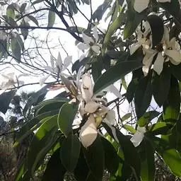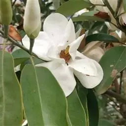 深山含笑的花 常绿乔木,高达20米,各部均无毛;树皮薄、浅灰色或灰褐色平滑不裂;芽、嫩枝、叶下面、苞片均被白粉。