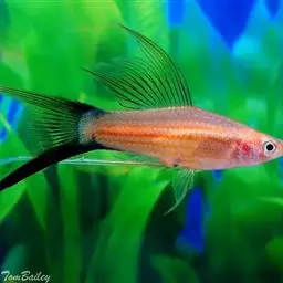 燕尾(Swallow Tail):表现为身体各鳍的鳍条不规则延长。燕尾的公鱼和缎带公鱼一样,如果燕尾基因影响到了臀鳍,也会造成不育。