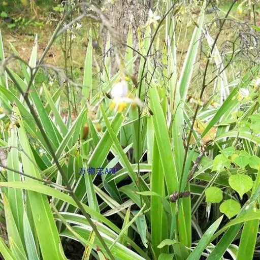 银边山菅兰 园艺栽培品种.草本,根状茎横走,结节状,节上生纤细而硬的须根.茎挺直,坚韧,近圆柱形.叶近基生,2列,叶片革质,线状披针彤,边缘有淡黄色边 ,长30~60 cm,宽1.0~2.5 cm.花葶从叶丛中抽出,圆锥花序长10~30 cm;花一般夏季开放,淡紫色、绿白色至淡黄色,小花梗短,苞片匙形,花被裂片6,二轮,披针形;雄蕊6;子房上位,花柱线状.