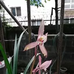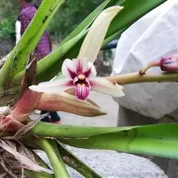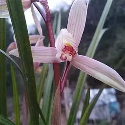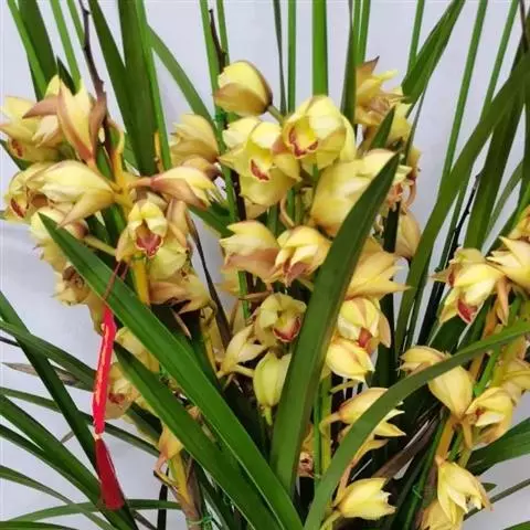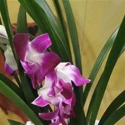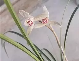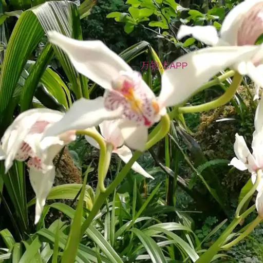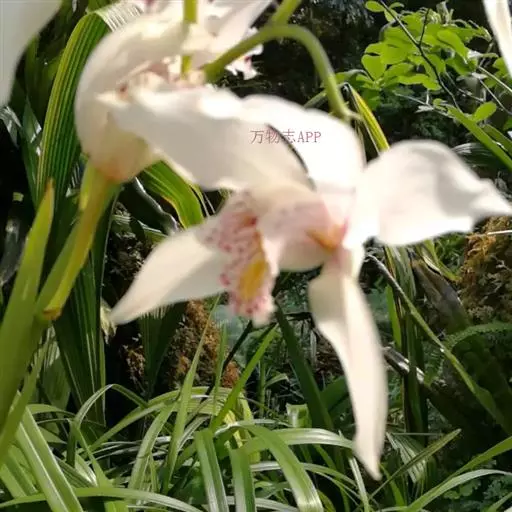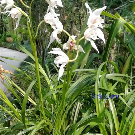美花兰(学名:Cymbidium insigne Rolfe):地生或附生植物;假鳞茎卵球形至狭卵形,长5-9厘米,宽2.5-4厘米,包藏于叶基之内。叶6-9枚,带形。花葶近直立或外弯,较粗壮;总状花序具4-9朵或更多的花;萼片与花瓣白色或略带淡粉红色,有时基部有红点,唇瓣白色,侧裂片上通常有紫红色斑点和条纹,中裂片中部至基部黄色,亦有少数斑点与斑纹;花瓣狭倒卵形,长2.8-3厘米,宽1-1.2厘米;唇瓣近卵圆形,略短于花瓣,3裂。花期11-12月。