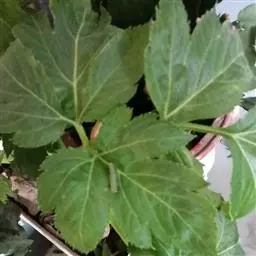 叶片轮廓为卵形至三角状卵形,长15-30厘米,宽15-25厘米;茎上部叶简化为无叶或带有小叶、略膨大的叶鞘,叶鞘薄膜质,常带紫色。第一回和第二回裂片有长叶柄,小叶柄通常膝曲或弧形弯曲;末回裂片有短柄或近无柄、卵形或菱状长圆形、纸质,长3-5厘米,宽2.5-3.5厘米,3裂,两侧裂片又多为不等的2深裂,基部截形至心形,顶端具长尖,边缘有粗锯齿、大小不等的重锯齿或缺刻状深裂,齿端有锐尖头,两面脉上疏被短糙毛或下表面无毛。
