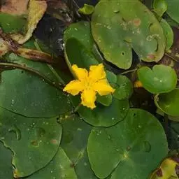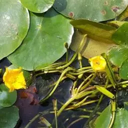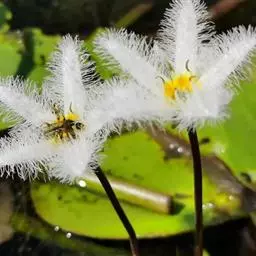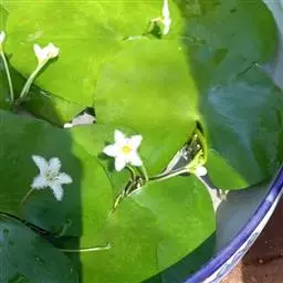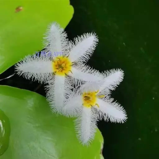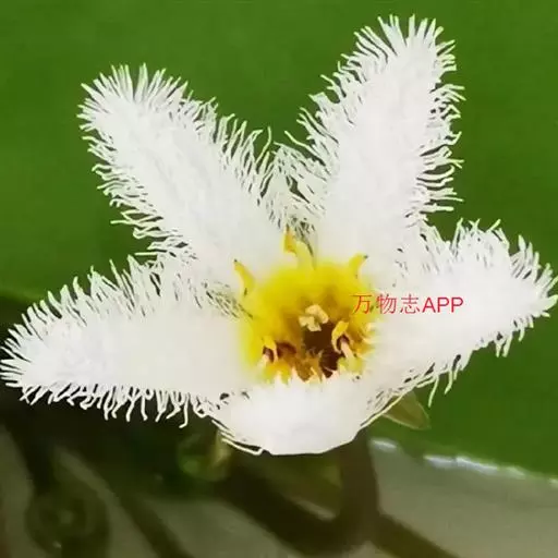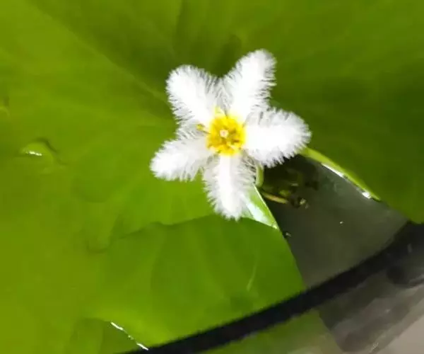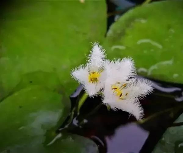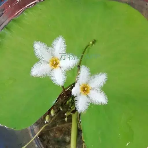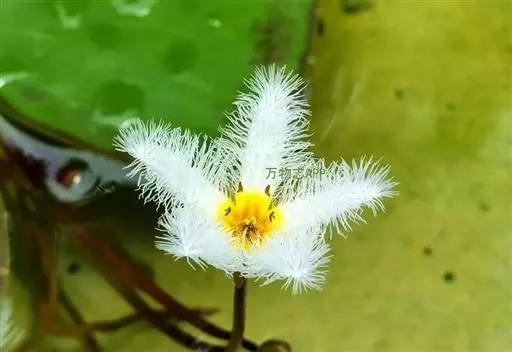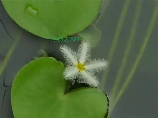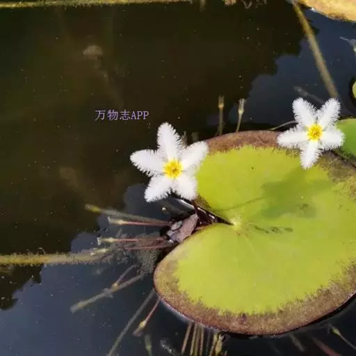 金银莲花(学名:Nymphoides indica (L.) O. Kuntze):多年生水生草本。茎圆柱形,不分枝,形似叶柄,顶生单叶。叶飘浮,近革质,宽卵圆形或近圆形,下面密生腺体,基部心形,全缘,具不甚明显的掌状叶脉,叶柄短,圆柱形,花多数,簇生节上,花梗细弱,圆柱形,不等长,分裂至近基部,裂片长椭圆形至披针形,先端钝,脉不明显;花冠白色,基部黄色,分裂至近基部,冠筒短,裂片卵状椭圆形,先端钝,腹面密生流苏状长柔毛。蒴果椭圆形,花果期8-10月。