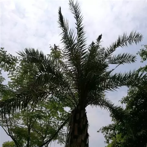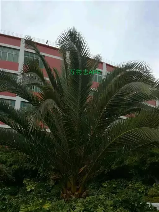 加那利海枣(学名:Phoenix canariensis Chabaud)是棕榈科刺葵属植物,因产于非洲的加那利群岛而得名。单干直立,自然高度可达18米,干径50-90厘米,幼时被以枯叶,老树则叶柄基部残存。具波状叶痕,羽状复叶,顶生丛出。雌雄异株,肉穗花序自叶间抽出,长可达2米。浆果,果实卵状球形至长椭圆形,先端微突。种子椭圆形,中央具深沟、灰褐色。每年3-4月问抽生花序,5月上旬开花,花小,9-10月间果实成熟,自然结实率低。 [1-2]
