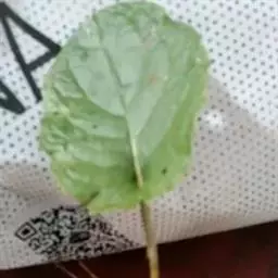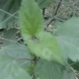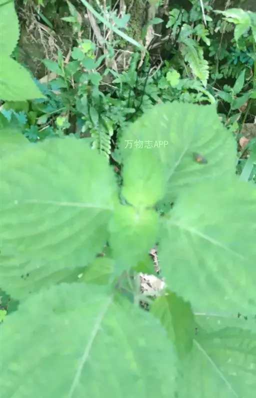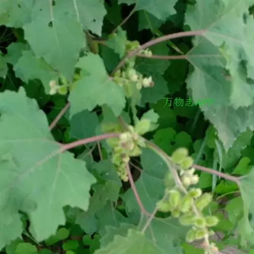 叶三角状卵形或心形,长4-9厘米,宽5-10厘米,近全缘,或有3-5片不明显浅裂,顶端尖或钝,基部稍心形或截形,与叶柄连接处成相等的楔形,边缘有不规则的粗锯齿,有三基出脉,侧脉弧形,直达叶缘,脉上密被糙伏毛,上面绿色,下面苍白色,被糙伏毛;叶柄长3-11厘米。