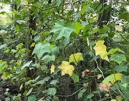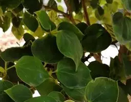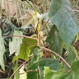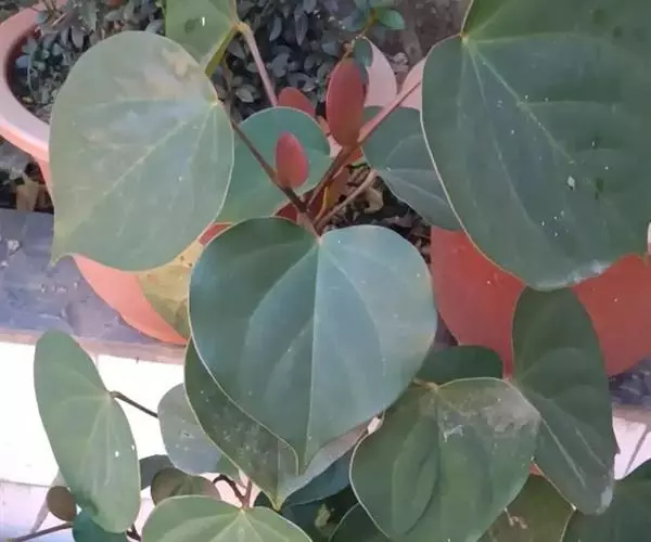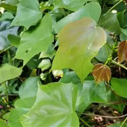 叶革质,阔卵圆形,全缘,或嫩叶有掌状3浅裂,长10-17厘米,宽9-13厘米,嫩叶有时更大;先端尖锐,基部心形,或偶为短的阔楔形,上面深绿色,发亮,下面无毛;掌状脉5-7条,在上面明显,在下面突起,网脉在上下两面均明显;叶柄长3-6厘米,嫩叶的叶柄更长,圆筒形,无毛;托叶椭圆形或倒卵形,长2-3厘米,宽1-2厘米,有明显的脉纹。