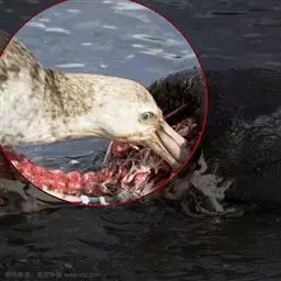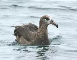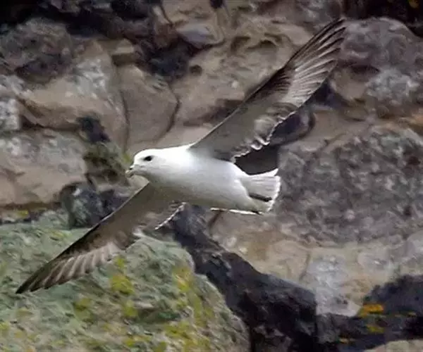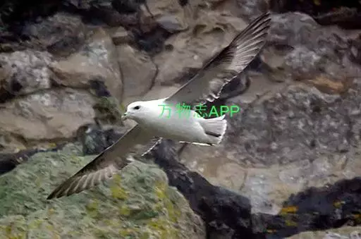暴风鹱(学名:Fulmarus glacialis):为鹱形目鹱科下的一种中型海鸟,共有3个亚种。体长45-48厘米,体重0.5-1千克。外形和体色很像鸥,头、颈和下体白色,眼前有一黑色斑点,背、翅和尾珠灰色或淡褐灰色,嘴短,灰绿色或黄色。暴雪鹱和鸥的区别在于它呈管状的鼻和由数枚角质片构成的嘴以及较鸥窄而长的翅。不过在野外只要看到它那强直的翅和在紧贴海面上空时而两翅迅速地鼓动,时而又长时间地在海面上空滑翔,就不难将它从鸥群中指认出来。