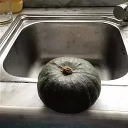 瓜形似佛手,又似皇冠,形状怪异又名“小丑南瓜”,浅黄白色,瓜长11厘米左右,高8厘米,重约130克。