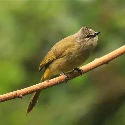 黄腹冠鹎:体长19-24厘米,是一种体型略大的褐色鹎。头顶橄榄褐色具黑褐色羽冠。白色的喉膨起,…