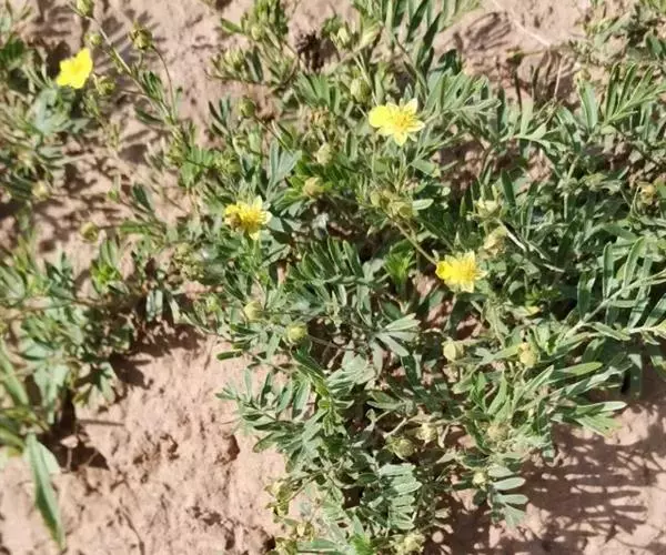 多年生草本或亚灌木。根圆柱形,纤细,木质。花茎直立或上升,高5-20厘米,密被 疏柔毛或微硬毛。羽状复叶,有小叶5-8对,最上面2-3对小叶基部下延与叶轴汇合,连 叶柄长3-8厘米;叶柄密被疏柔毛或微硬毛,小叶片无柄,对生稀互生,椭圆形或倒卵椭圆形,长0.5-1.5厘米,宽0.4-0.8厘米,顶端常2裂,稀3裂,基部楔形或宽楔形,两面绿色,伏生疏柔毛;下部叶托叶膜质,褐色,外面被微硬毛,稀脱落几无毛,上部茎生叶托叶草质,绿色,卵状椭圆形,常全缘稀有齿。近伞房状聚伞花序,顶生,疏散;花直径0.7-1厘米;萼片卵圆形,顶端急尖,副萼片椭圆形,顶端急尖或钝,比萼片短或近等长,外面被疏柔毛;花瓣黄色,倒卵形,顶端圆钝,比萼片稍长;心皮沿腹部有稀疏柔毛;花柱侧生,棒形,基部较细,顶端缢缩,柱头扩大。瘦果表面光滑。花果期5-9月。