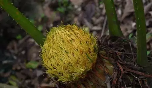 叶呈叉状二回羽状深裂,长2~3米,叶柄两侧具宽短的尖刺;羽片间距离约4厘米,叉状分裂;裂片条状披针形,边缘波状,长20~30厘米,宽2~2.5厘米,幼时被白粉,后呈深绿色,有光泽,先端钝尖,基部不对称。雄球花圆柱形,长15~18厘米,径约4厘米,梗长3厘米,粗1.5厘米;小孢子叶近匙形或宽楔形,光滑,黄色,边缘橘黄色,长1~1.8厘米。宽约8毫米,顶部不育部分长约8毫米,有绒毛,圆或有短而渐尖的尖头,花药3~4个聚生;大孢子叶基部柄状,橘黄色,长约8厘米,柄与上部的顶片近等长或稍短,胚珠1~4枚,着生于大孢子叶叶柄的上部两侧,近圆球形,被绒毛,上部的顶片菱形倒卵形,宽约3.5厘米,边缘具蓖齿状裂片,裂片钻形,站立,长1.5~2厘米。种子成熟后变黄,长约2.5厘米。
