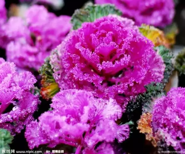 叶片形态美观多変,心叶色彩绚丽如花,整株酷似一朵盛开的牡丹花,人们形象地称之为“叶牡丹”。又因其喜冷凉气候,较耐寒,可忍受多次短暂的霜冻,在百花凋零的冬季和早春,是布置露地花坛、花台及盆栽陈设美化时不可多得的优秀用材。