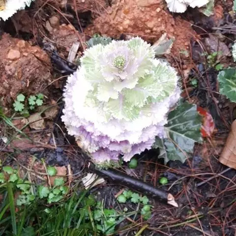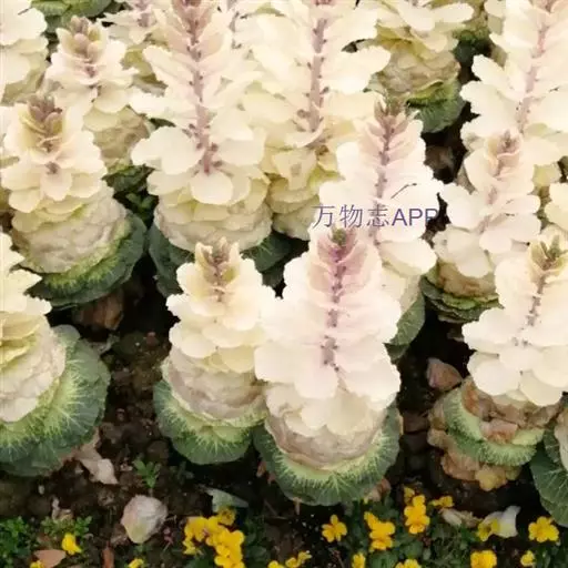 羽衣甘蓝为二年生观叶草本花卉,为甘蓝的园艺变种。基生叶片紧密互生呈莲座状,叶片有光叶、皱叶、裂叶、波浪叶之分,外叶较宽大,叶片翠绿、黄绿或蓝绿,叶柄粗壮而有翼,叶脉和叶柄呈浅紫色,内部叶叶色极为丰富,有黄、白、粉红、红、玫瑰红、紫红、青灰、杂色等,非常漂亮。叶片的观赏期为12月至翌年3、4月份。株高一般为20-40厘米,在4月份温暖、长日照条件下抽薹开花,总状花序,花浅黄色。果实为角果,6月份种子成熟,种子黑褐色扁球形,每1克种子有300粒左右,不采种时应及时剪去花薹,以延长叶片的观赏期。