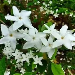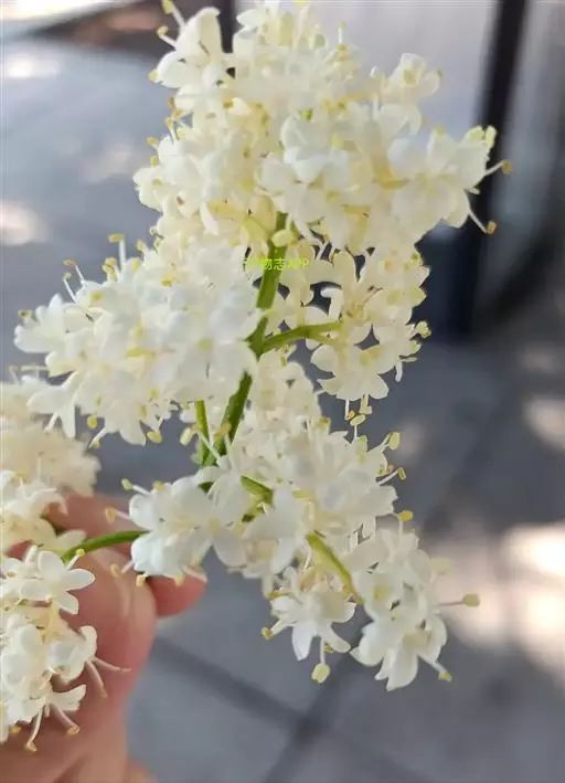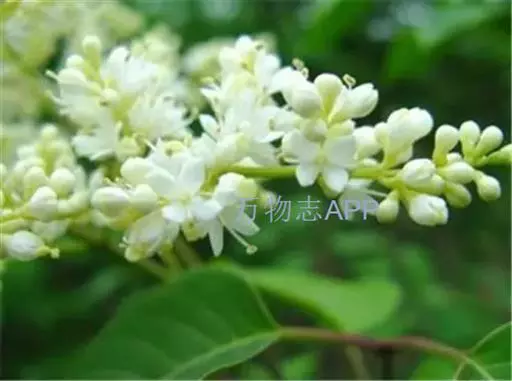 圆锥花序由1到多对着生于同一枝条上的侧芽抽生,长10-20(-27)厘米,宽8-20厘米;花序轴、花梗和花萼均无毛;花序轴具皮孔;花梗长0-2毫米;花萼长1.5-2毫米,萼齿钝、凸尖或截平;花冠白色,呈辐状,长4-5毫米,花冠管长约1.5毫米,裂片卵形,长2-3毫米,先端锐尖;花丝与花冠裂片近等长或长于裂片可达1.5毫米,花药黄色。