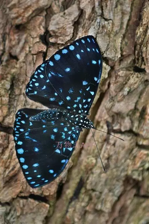 雌性明显较大。翅表深蓝色,有光泽。前翅外缘有 1 列小白点,亚外缘 线和外横线由相互套叠的“<”纹构成,中带的白纹上方长形,下方为点状,中室有蓝白纹;后翅外缘有 1 列白点,亚外缘有 1 列“<”形白纹,翅内侧还布有星点状蓝白点。翅里黑色,斑纹同翅表。浙江一年发生三代,以蛹越冬。