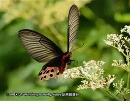 台湾宽尾凤蝶又名阔尾凤蝶、宽尾凤蝶。为昆虫纲、鳞翅目、凤蝶科、宽尾凤蝶属物种。该种1932年被首次发现,为台湾特产,美丽稀有,有中国“国蝶”的美誉。生活史有成虫,卵,幼虫,蛹4个阶段,一年发生一代,以蛹越冬。本种与宽尾凤蝶很相似,但后翅的斑纹差别很大。
