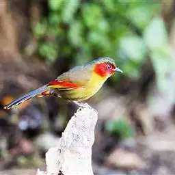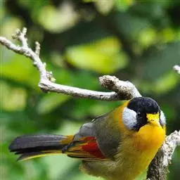 银耳相思鸟小型鸟类,体长14~18厘米。头顶黑色,耳羽银灰色,前额橙黄色;外侧飞羽橙黄色,基部朱红色,…