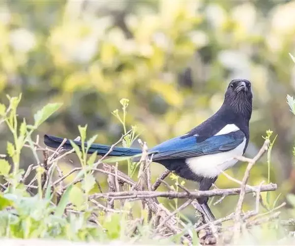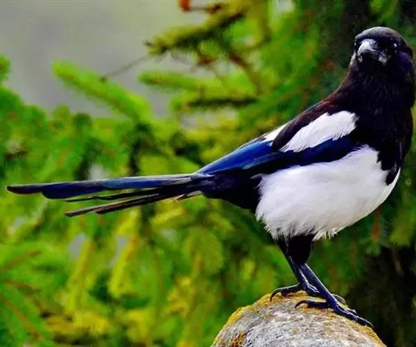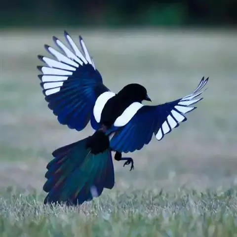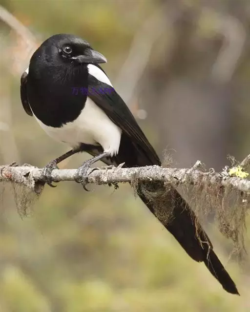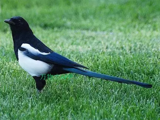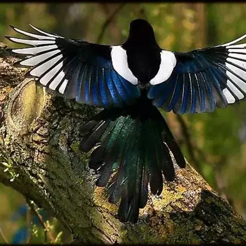 喜鹊(学名:Pica pica)是鸟纲鸦科的一种鸟类。共有10个亚种。体长40-50厘米,雌雄羽色相似,头、颈、背至尾均为黑色,并自前往后分别呈现紫色、绿蓝色、绿色等光泽,双翅黑色而在翼肩有一大形白斑,尾远较翅长,呈楔形,嘴、腿、脚纯黑色,腹面以胸为界,前黑后白。留鸟。