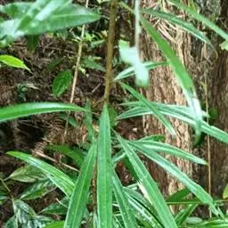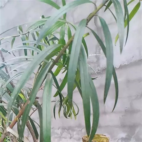 叶常密生枝条的上部,叶间距离极短,革质或薄革质,斜展,窄椭圆形、窄矩圆形或披针状椭圆形,长 1.5~4 公分,宽 0.3~0.8 公分(幼树或萌芽枝的叶长达 5.5 公分,宽 1.1 公分,先端钝,有突起的小尖头),上面绿色,有光泽,中脉隆起,下面色淡,干后淡褐色,中脉微隆起,伸至叶尖,边缘微向下卷曲,先端微尖或钝,基部健窄,叶柄极短,长 0.15~0.4 公分。