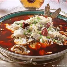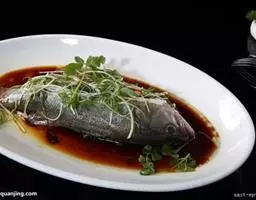 清蒸过江鱼是一道美食,由活鲤鱼、葱等原料做成。