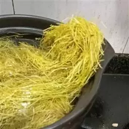 取少量菟丝子用沸水浸泡后,表面有黏性;加热煮至种皮破裂时,露出黄白色卷须状的胚,形如吐丝,即为正品。