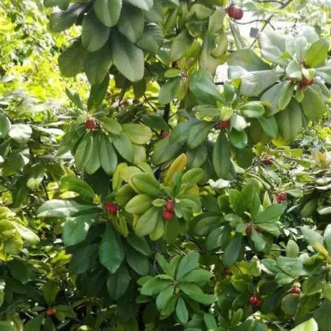 果实长约1厘米,成熟时黄红色,干后果皮薄革质,稍发亮,有残存花柱;种子1个,黑色,基部有黄色流苏状的假种皮。花期4-5月。