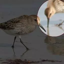 阔嘴鹬是涉禽,体长17厘米。特征为翼角常具明显的黑色块斑并具双眉纹。与黑腹滨鹬平滑下弯的嘴相比,…