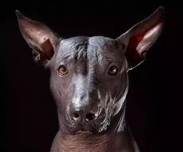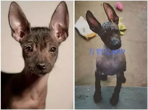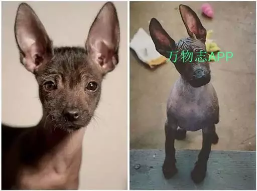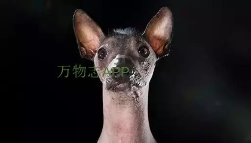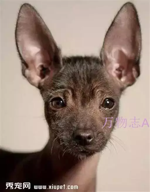 墨西哥无毛犬那粉红色、皱巴巴的皮肤上布满雀斑,身上有黄褐色毛发覆盖的地方,仅仅在血管清楚可见的两耳之间、黏糊糊的下颚,以及老鼠般的尾巴末端