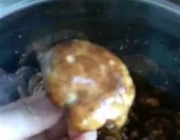 5.加入一点黄酒,大火再次烧开后,打出表面的浮沫,以保持沸腾状态的小火煮10分钟(中间翻面)