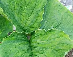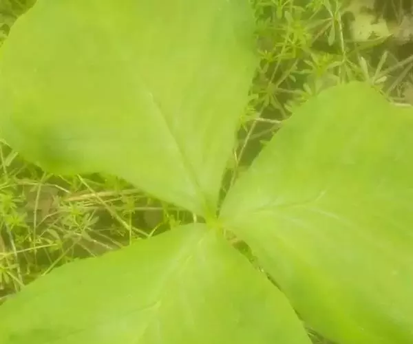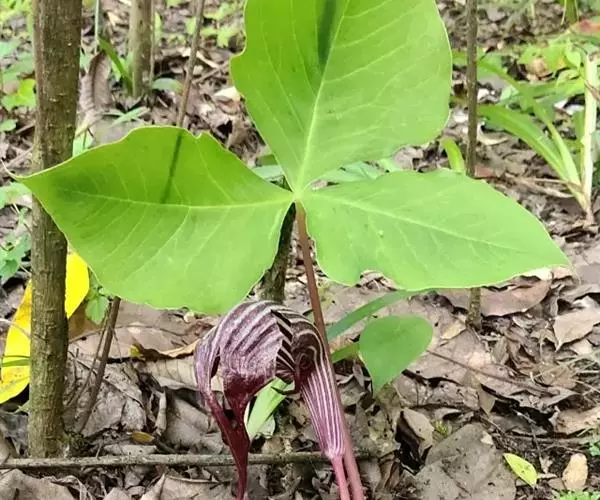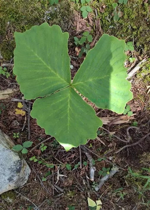 块茎近球形,直径3-5厘米,密生长达10余厘米的纤维状须根。鳞叶3-4,内面2片狭长三角形,长9-15厘米,基部展开宽可达5厘米,绿色或紫色。叶1,叶柄长20-30厘米,黄绿色,基部粗可达2厘米,无鞘,光滑或多少具疣状突起;叶片3全裂,稀3深裂,裂片具0.5-1厘米的柄或无柄,稀基部联合,干时二面黄绿色,中肋背面明显隆起,侧脉斜伸,向边缘远离,脉距1-2厘米,集合脉距边缘0.5-1.5厘米,网脉明显;中裂片倒心形,顶部平截,中央下凹,具正三角形的尖头,向基部渐狭,宽远胜于长,长(5-)9-9.5厘米(包括5-10毫米长的尖头),宽(6-)10.5-12.5厘米;侧裂片较大,长6.5-13厘米。宽(5.5-)11-13厘米,宽斜卵形,骤狭短渐尖,外侧宽,基部圆形,内侧楔形或圆形。