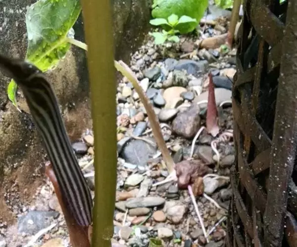 花序柄短于叶柄,长9-25厘米,粗3-5毫米,绿色或淡紫色,具细疣状凸起或否。佛焰苞青紫色,基部黄绿色,管部具白色条纹,向上隐失,上部全为深紫色,管部圆柱形,长2.4-6.5厘米,粗1.8-2.6厘米,喉部边缘斜截形,两侧下缘相交成直角;檐部长圆披针形,长4.5-10厘米,宽3-3.5厘米,由基部稍内弯,先端骤狭渐尖。肉穗花序单性,雄花序长1.5-3厘米,花序轴粗可达8毫米,连花粗1.5厘米,花疏,附属器基部略细成柄状,或几无柄,中部以上渐细,最后成线形,从佛焰苞喉部附近下弯,然后之字形上升或弯转360度后上升或蜿蜒下垂;雌花序长1-2.5厘米,下部粗1.2厘米,附属器基部骤然扩大至5-7毫米,具长5-10毫米的柄,余同雄序附属器。雄花具长柄,柄长2.2-2.5毫米,花药2-5,药室顶部滆合,马蹄形开裂;雌花:子房长卵圆形,先端渐狭为短的花柱,柱头盘状,密被短绒毛,1室,胚珠多数(6-10)。