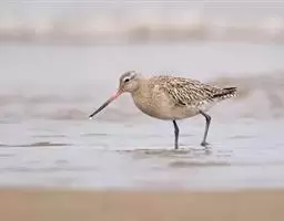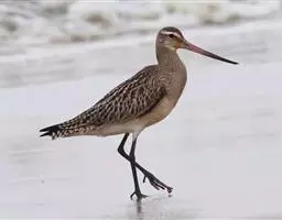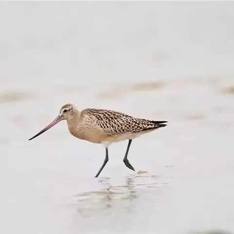 斑尾塍鹬(学名:Limosa lapponica):体重245-320克,体长326-386毫米,体型中等。繁殖期羽多有棕栗色。嘴较尾长,直或略微向上翘。跗蹠长度居中,后缘具盾状鳞。中趾与外趾之间具退化的蹼,中趾外侧有栉状缘。冬季头顶灰白色,具黑褐色纵纹,肩、上背黑褐色,羽缘浅棕,下背、腰、尾上覆羽白色沾棕,具灰褐色羽干纹,尾羽棕,具灰褐色横斑;眉纹棕白,颏、喉白色,前胸浅褐色,其余下体淡棕。嘴长而上翘,红色,尖端黑色;脚黑褐。