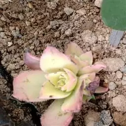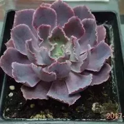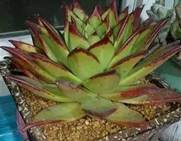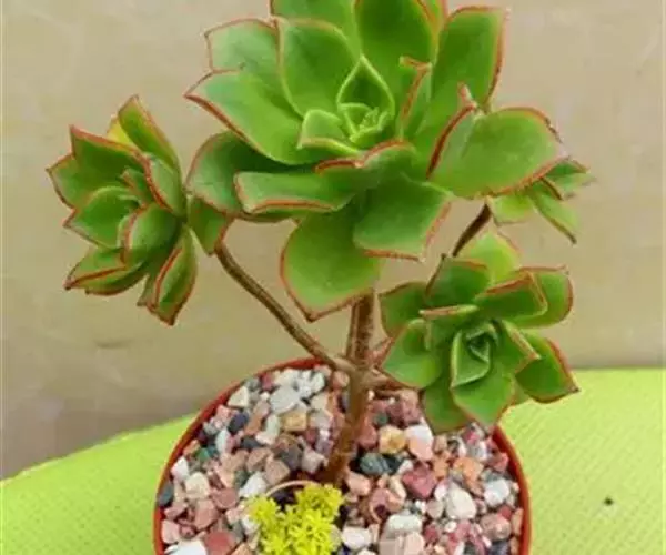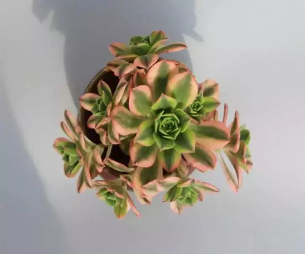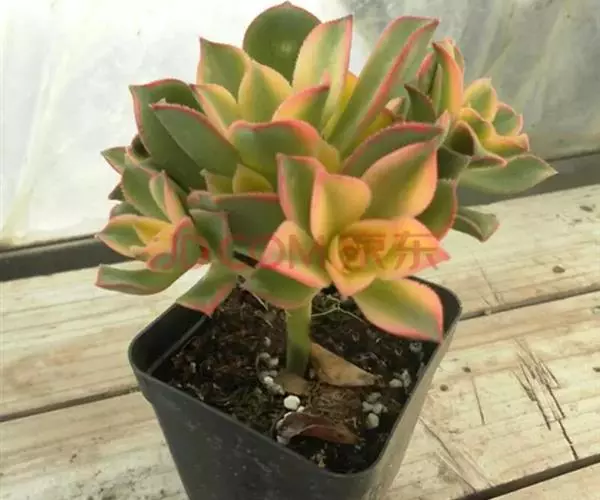 植株稍具分枝,叶肉质,呈莲座状排列。叶片倒卵圆形,顶端尖,正面中央稍凹,并具细绒毛,背面有龙骨状凸起,叶缘有睫毛状细锯齿,叶片色彩丰富,中央部分为杏黄色,与淡绿色间杂,外缘则呈红、红褐及粉红等色。花为总状花序,花后全株枯萎死亡,故栽培中一般不让植株开花。