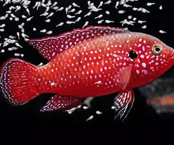 红宝石鱼属非三湖慈鲷类的非洲慈鲷,体形较短鲷大。该种鱼的特点在于全身靓丽的蓝色斑点和尾柄前面的大型黑斑。红宝石的名字来源于在它们繁殖期间会出现艳丽的红色。而实际上本种鱼有一些全身永远艳红的个体,但是在市场上很难看到。原产地:从加纳到多哥的刚果河、尼罗河流域的森林溪流中;食性:肉食性且有鱼食性会食小鱼。活动水层:全部水层,较喜欢在底层活动。产地:非洲尼罗河流域和利比亚、尼日尔、刚果等国。