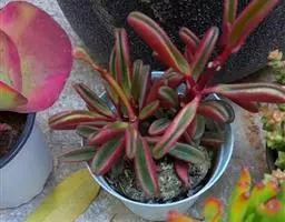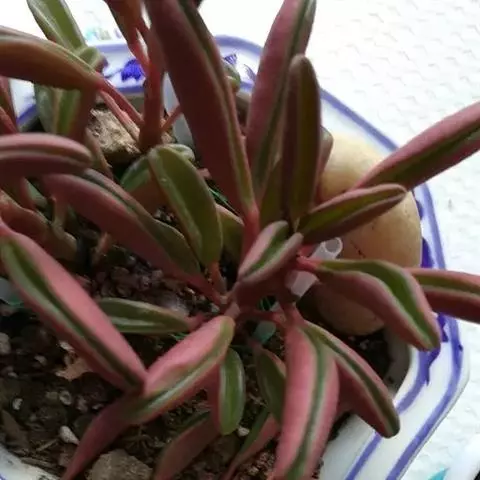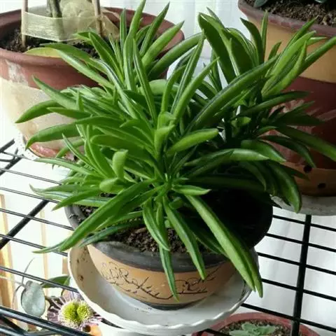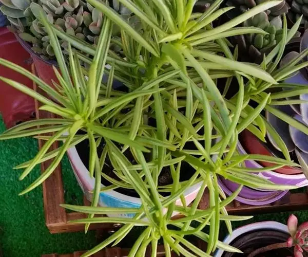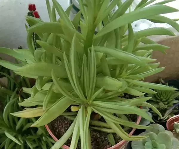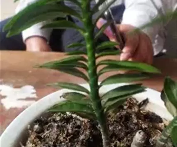茎秆粗壮,叶顶端轮生,长5-6厘米、宽1.7厘米、厚0.6厘米,先端尖、基部棒糙形,一侧中间圆弧形突出,另一侧平直,弧形一侧的边缘较薄,有透明的条纹,平直的一侧边缘厚,整个叶就像一把斧子。带粉的灰绿色。花序很长,花黄绿色。叶片肉质,株形小巧丰满,适合半阴环境,是理想的桌面小盆栽。