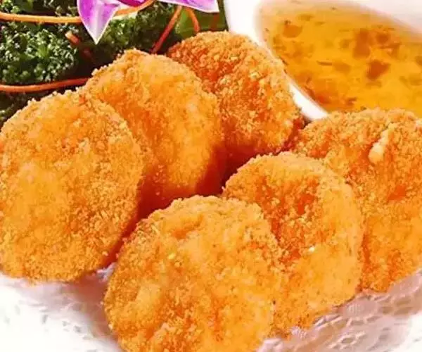 炸虾饼,绝对是湛江的一大特色。在外地是很少可以吃上这么正宗的传统小食。由于湛江盛产大虾,海产品特别丰富,据说当年发明者的灵感、构思就是来自湛江丰富的海产品上。湛江的炸虾饼制作很简单:米粉加葱花调糊,用小铁器盛装,再加几条鲜虾,然后放进油锅炸至金黄色即捞起,配以少量椒盐、一片生菜,香味诱人。湛江炸虾饼最大的特色是饼香、脆口、好味,并夹带着海虾的清香,味道让人一尝试难忘。