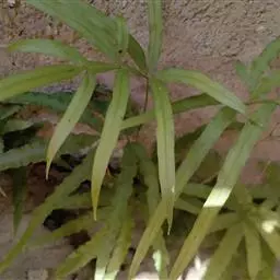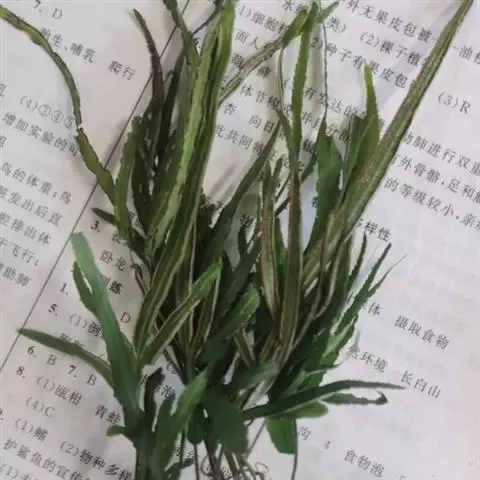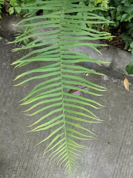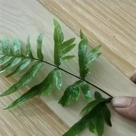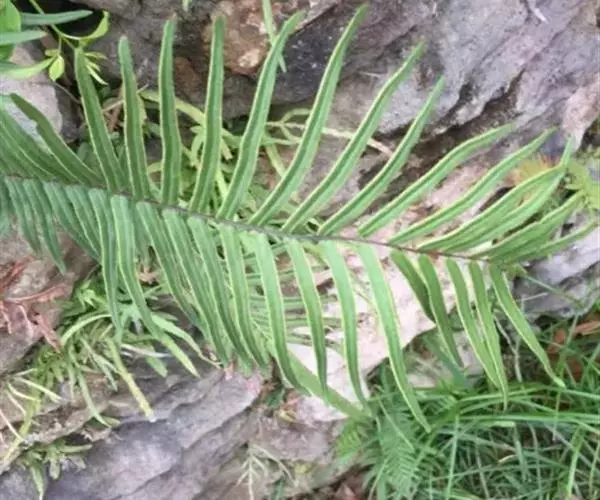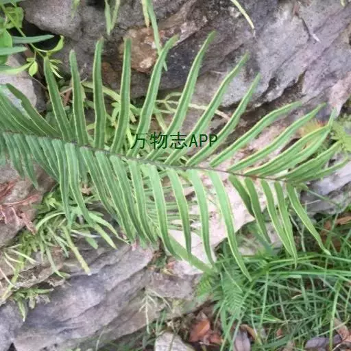 叶边仅有矮小锯齿,顶生三叉羽片的基部常下延于叶轴,其下一对也多少下延。叶簇生,二型或近二型;柄长30-45厘米(不育叶的柄较短),基部粗约2毫米,禾秆色,有时带棕色,偶为栗色,表面平滑;叶片卵圆形,长25-30厘米,宽15-20厘米,一回羽状;不育叶的羽片(2)3-5对(有时为掌状),通常对生,斜向上,基部一对有短柄并为二叉(罕有三叉),向上的无柄,狭披针形或披针形(第二对也往往二叉),长10-18(24)厘米,宽1-1.5(2)厘米,先端渐尖,基部阔楔形,叶缘有软骨质的边并有锯齿,锯齿往往粗而尖,也有时具细锯齿;能育叶的羽片3-5(8)对,对生或向上渐为互生,斜向上,基部一对有短柄并为二叉,偶有三叉或单一,向上的无柄,线形(或第二对也往往二叉),长12-25厘米,宽5-12毫米,先端渐尖并有锐锯齿,基部阔楔形,顶生三叉羽片的基部不下延或下延。主脉下面强度隆起,禾秆色,光滑;侧脉两面均明显,稀疏,斜展,单一或从基部分叉。叶干后纸质,绿色或灰绿色,无毛;叶轴禾秆色,表面平滑。