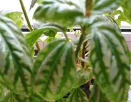 叶多汁,干时变纸质,同对的近等大,倒卵形,长2.5-6厘米,宽1.5-3厘米,先端骤凸,基部楔形或钝圆,边缘自下部以上有数枚不整齐的浅牙齿或啮蚀状,上面深绿色,中央有2条(有时在边缘也有2条)间断的白斑,下面淡绿色,钟乳体梭形,长0.3-0.5毫米,两面明显,基出脉3,其侧生二条稍弧曲,伸达上部与邻近的侧脉环结,二级脉在上部约3对,明显,下部的不明显,外向的二级脉数对,在近边缘处环结;叶柄长0.7-1.5厘米;托叶草质,淡绿色,干时变棕色,长圆形,长1-1.3厘米,早落。