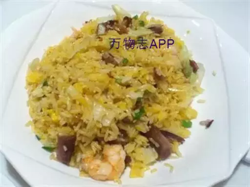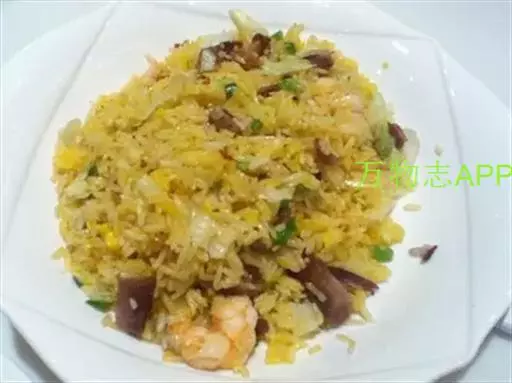 原料:熟虾肉40克,叉烧细丁80克,冬菇丁20克,葱花10克,净蛋80克,油20克,精盐2克,味精2克,白饭300克。