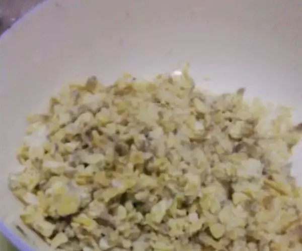 1、用油起锅,将鸡蛋放在锅中,加入精盐、味精、白饭炒透;