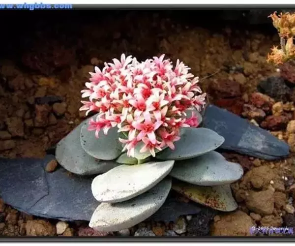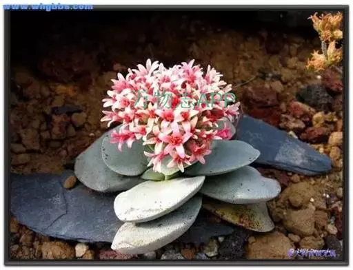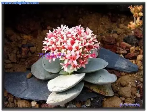 叶子表面宽厚,富肉质感且带有磨纱质感,看像石头质地;开红色小花,生于植株顶部,倒伞形密生,形状像花…