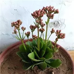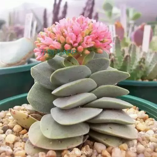 叶片为圆弧状,一般四角对生,呈叠加状态,喜欢温暖、干燥,阳光充足的环境,加强日照时叶片会呈淡粉色,叶面多白色小点,花类似神刀,由无数小红花锦簇而成。