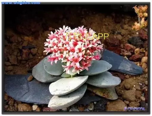 叶子表面宽厚,富肉质感且带有磨纱质感,看像石头质地;开红色小花,生于植株顶部,倒伞形密生,形状像花球一样。