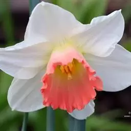 水仙花瓣多为6片,也有8片的,酷似椭圆形,花瓣末处呈鹅黄色。花蕊外面有一个如碗一般的保护罩。花葶自叶丛中抽出,高于叶面;一般开花的多为4~5片叶的叶丛,每球抽花1~7支,多者可达10支以上;伞房花序(伞形花序)着花4~6朵,多者达10余朵;花白色,芳香;花期1~2月。