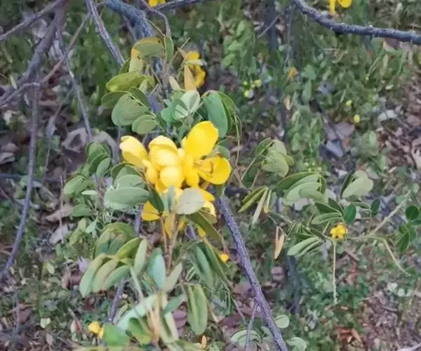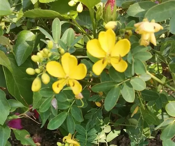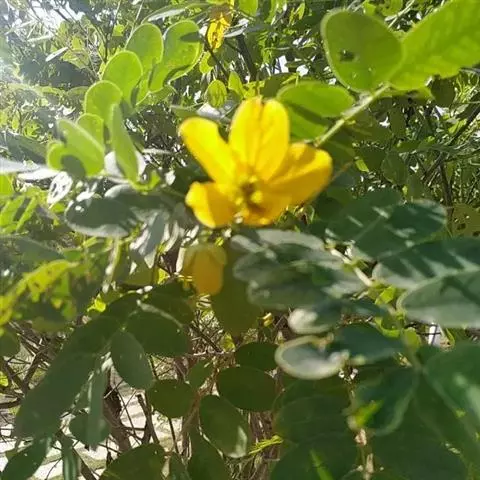 双荚决明(Senna bicapsularis(L.) Roxb.),又名双荚槐、金叶黄槐、金边黄槐,豆科(Leguminosae)直立灌木。偶数羽状复叶有小叶3-5对,基部一对小叶间具黑褐色腺体1枚。总状花序顶生,花鲜黄色。荚果圆柱状,内有两排黑褐色种子。花期4-11月,果期9-翌年3月。原产美洲热带地区,现广布于全世界热带地区。广东、广西有栽培。