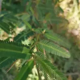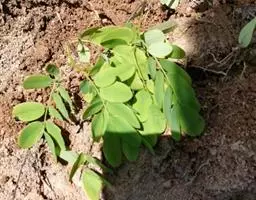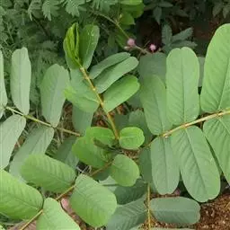叶长7-12厘米,有小叶3-4对;叶柄长2.5-4厘米;小叶倒卵形或倒卵状长圆形,膜质,长2.5-3.5厘米,宽约1.5厘米,顶端圆钝,基部渐狭,偏斜,下面粉绿色,侧脉纤细,在近边缘处呈网结;在最下方的一对小叶间有黑褐色线形而钝头的腺体1枚。