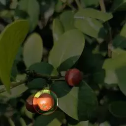 常绿灌木或小乔木。叶椭圆形,两端尖。果扁圆形,朱红色;味甜,可食。产自中国东南部,广东地区大量盆栽。
