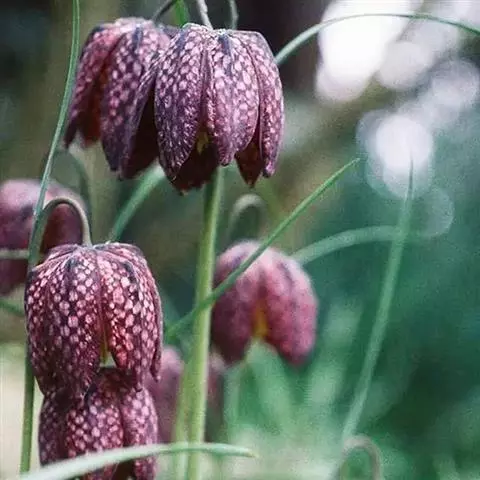 植株全长25-30厘米,茎约1/3埋于地下。鳞茎长5-6厘米,宽1厘米,近基部一侧常有几个扁球形小鳞茎。叶2枚,对生于植株中部以下,椭圆形或宽披针形,长10-11厘米,宽2.5-6.5厘米,先端具短尖头或近急尖,基部楔形,柄长3-4厘米。花单朵顶生,俯垂;花被片披针形,长3.5-5厘米,宽7-11毫米,紫红色,下部有近三齿状的黑色斑纹;花被片内面一基部有4个胼胝体,两侧各有一个近卵状半圆形的耳;花丝钻形,不等长;花药近狭矩圆形,长5-7毫米;花柱向上端稍增粗,具3裂柱头。花期4-5月。